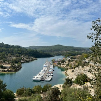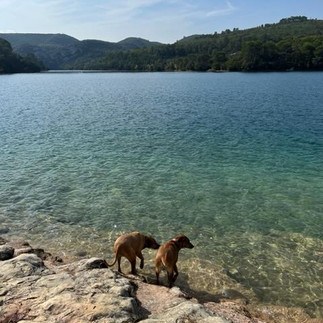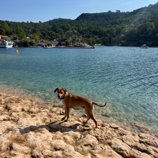 Nach einem Camper-Kafi geht es den kurvigen Strassen entlang des Verdons nach Esparron de Verdon, ein kleines Dörfchen am Ende des Stausees. Wir laufen entlang dem See und auch die Hundis kneippen ihre Pfoten im glasklar und kalten Seewasser.